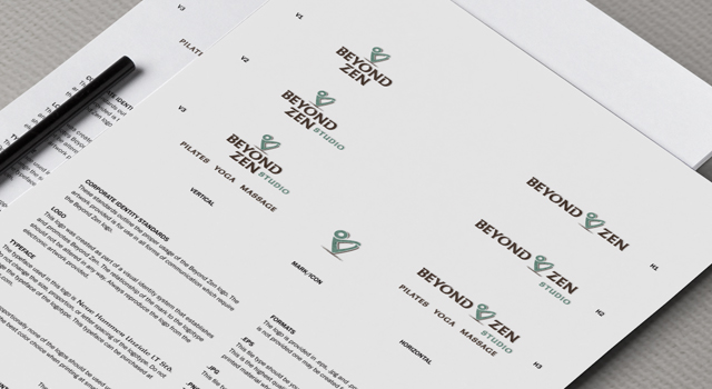 After hours of research on the competition, word clouds and sketching I landed on a beautiful brand signature that communicated what Beyond Zen represented. The brandmark is a cute, asexual figure in motion forming the boat position, which is iconic in both yoga and pilates.