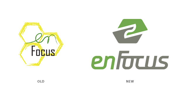 What enFocus members saw as cells in their brandmark resembled beehives to the uninitiated. Nobody knew how to read it. There also were significant illegibility problems – thin lines or a yellow that caused the logotype to fade; a rasterized brandmark lacking scalability of a vector brandmark and preventing its use on embroidered shirts or promotional banners. I maintained a hexagon shape, but offset it as two pieces coming together to evoke a handshake and a lowercase e. The new brandmark and logotype demonstrated a left-to-right movement, communicating progress. I chose three warm colors from a more refined Pantone palette: gray (corporate, serious and strong), green (organic growth, an idea, ingenuity) and a golden yellow that carried over from their previous identity.