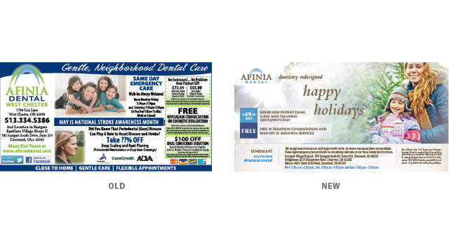 Afinia’s original print ads were jam-packed, and themselves put in mailers chock full of stuff. I redesigned the ads with a light, sparkly clean design and sophisticated offers. We used low amounts of typography to set a sharp contrast to every other piece in the mailers. We compared how well each ad ran. We found after a while that the mailers themselves were ineffective, so we stopped. I also helped them establish social networking and Google ad words, and make software choices.