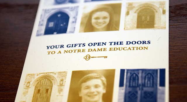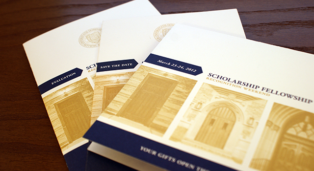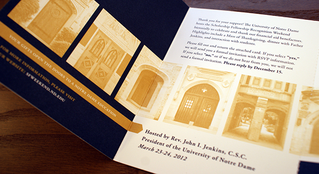 The 2012 Scholarship Fellowship Recognition Weekend focused around the event tagline, “Your gifts open the doors to a Notre Dame education.” This 15 piece campaign connects students and their specific donor(s) over this weekend.